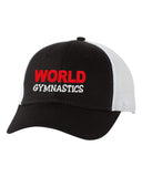 World Gymnastics Black & White Mesh-Back Trucker Cap - VC400 with Red & White Embroidery